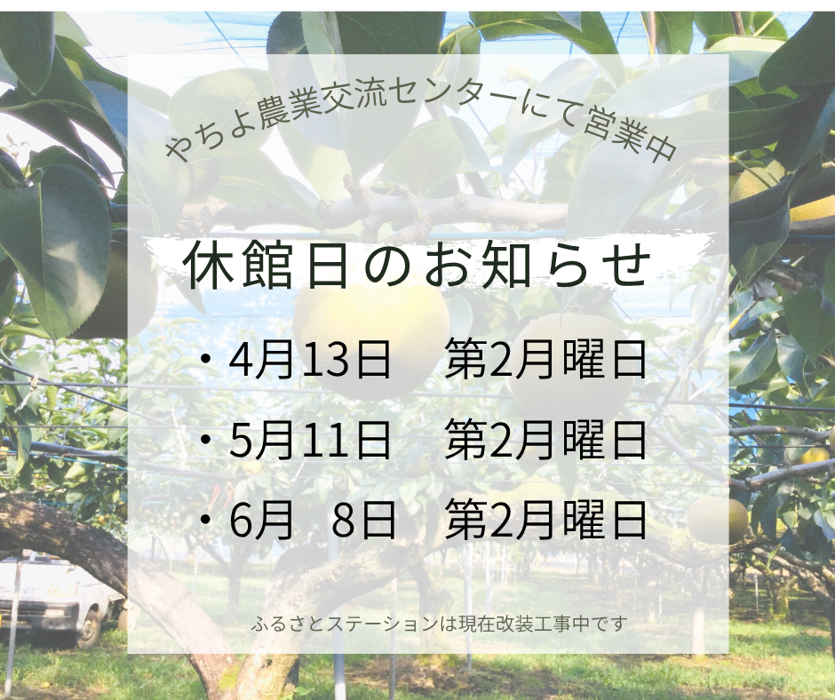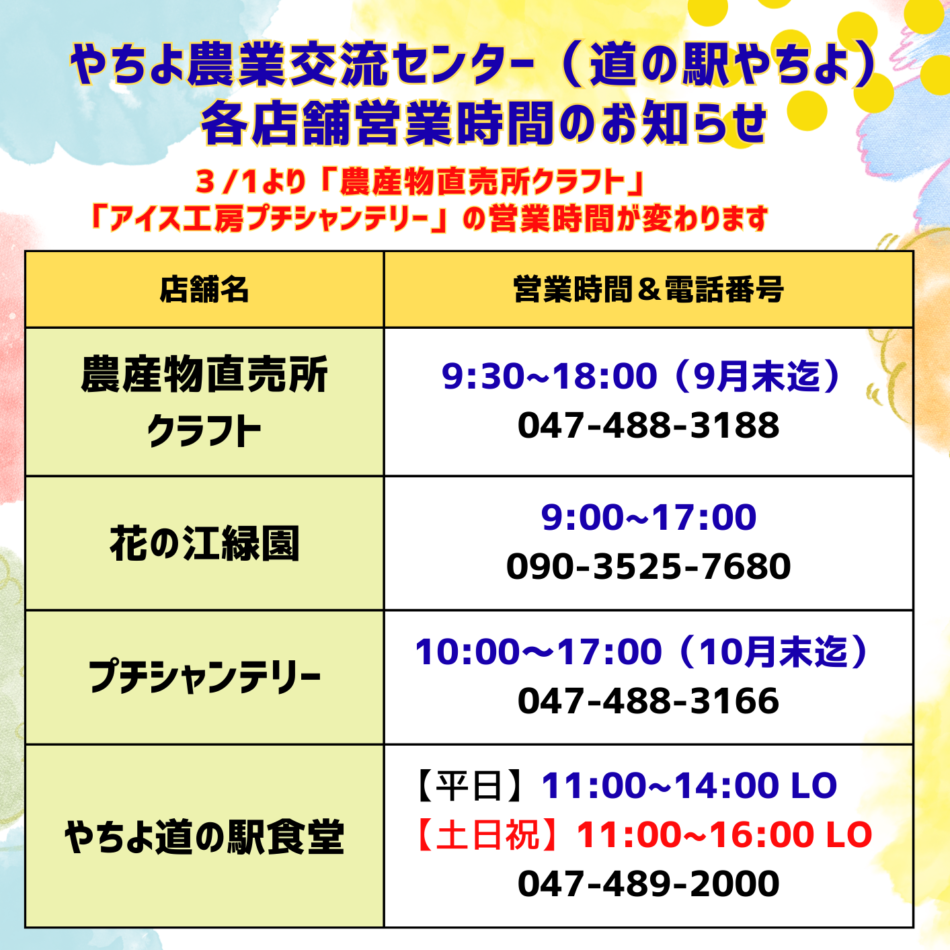 なお、農産物直売所「クラフト」、農事組合法人アイス工房「プチシャンテリー」、および「やちよ道の駅食堂」、「花の江緑園」は、農業交流センターにて引き続き営業しております。詳しくは、こちらをご覧ください。